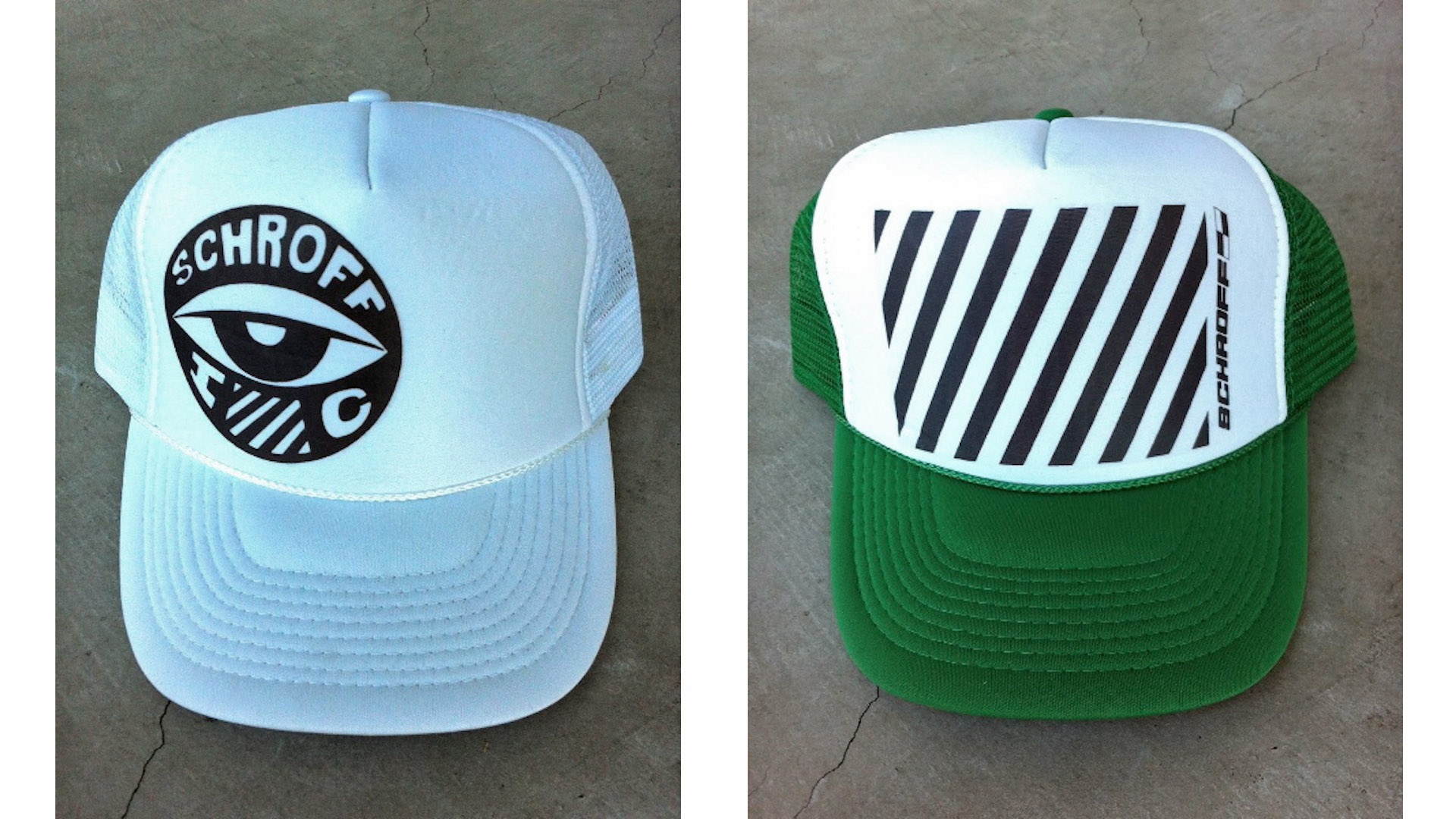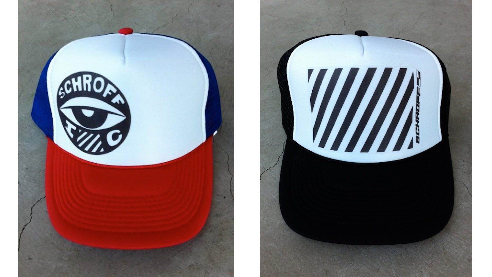 EYEBALL TRUCKER HAT and SLASH TRUCKER HAT by Peter Schroff / Tony MacKenzie